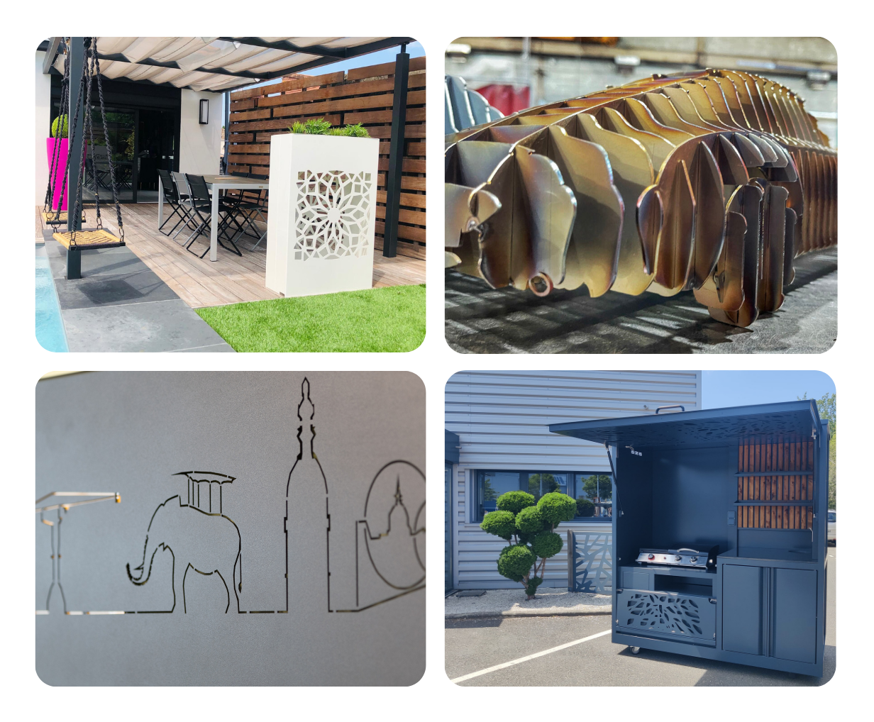 Nous concevons et fabriquons de la décoration métallique sur mesure, allant de la décoration intérieure comme des cadres décoratifs (ville de Nantes, planisphères, maquettes de Porsche, de DS ou même de l’île de Nantes…) à l’aménagement extérieur, avec des cuisines extérieures, cuisines box, pergolas, jardinières et bien d’autres réalisations personnalisées.